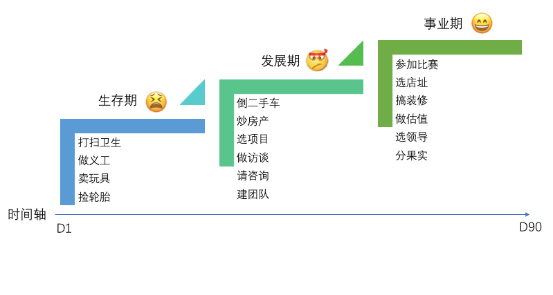 下面是笔者在开篇《真人秀背后的迷你创业课——系列文章介绍》中,梳理的一张图片。这张图简单总结了主角90天内做的主要事情: