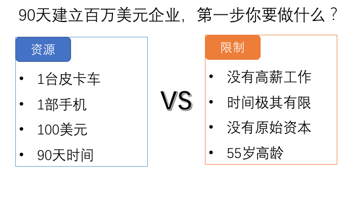 身上只有100美金,节目组给的1台车、1部没有联系人的手机,开启了他为期90天的挑战:目标是在90天结束的时候,建立起价值百万美元的企业。
